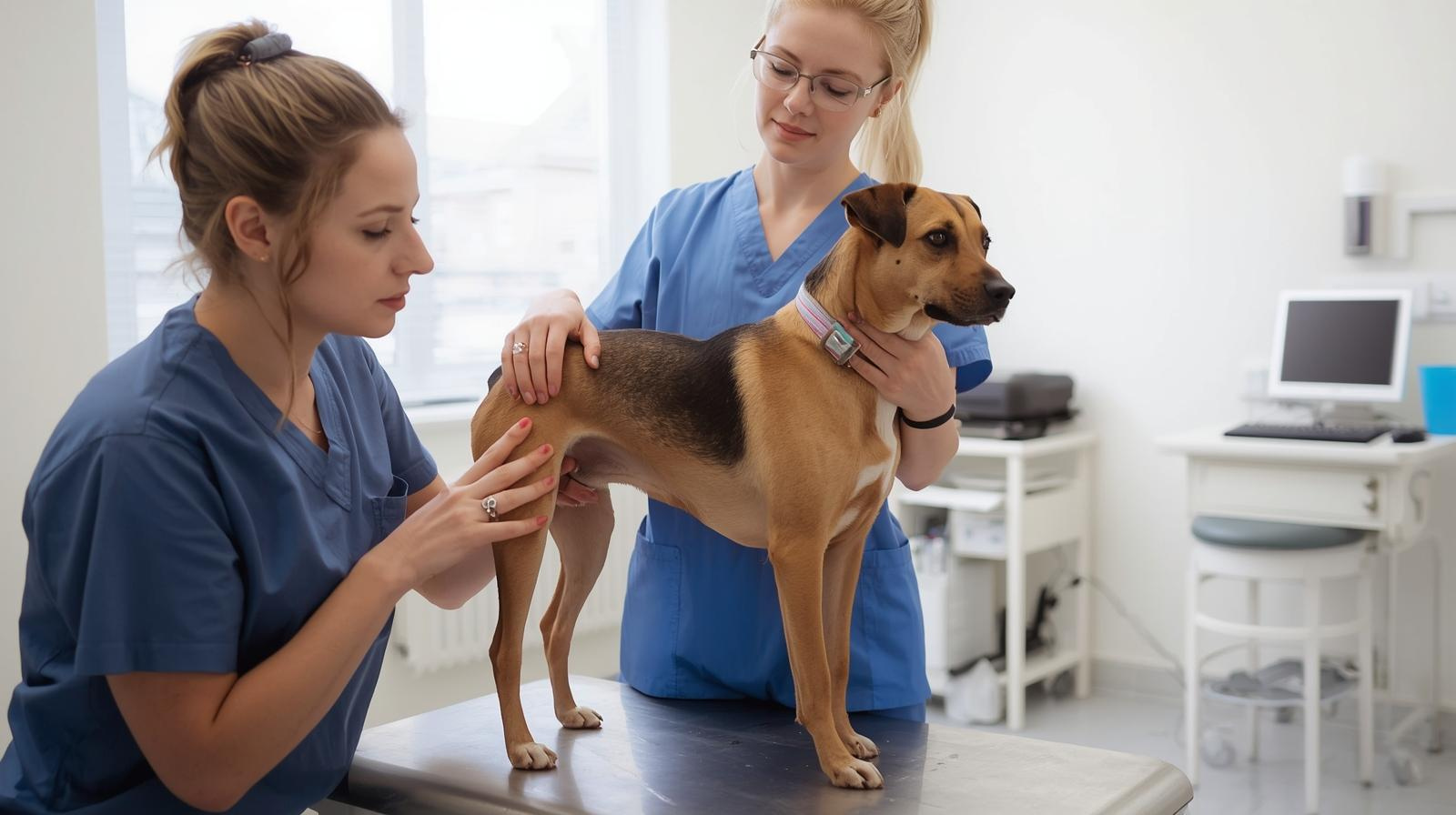veterinarian performing orthopedic and cardiac health clearance exam on dog