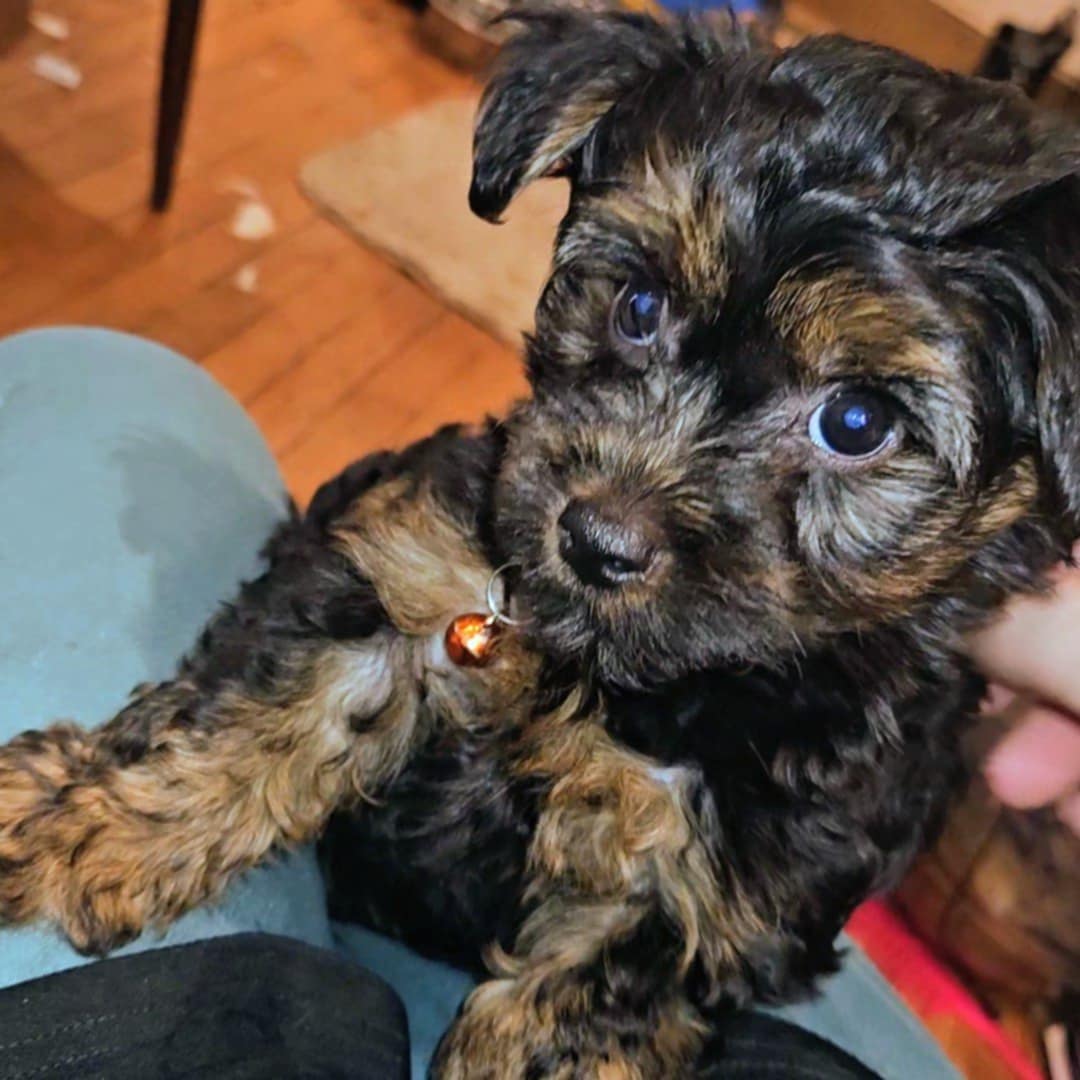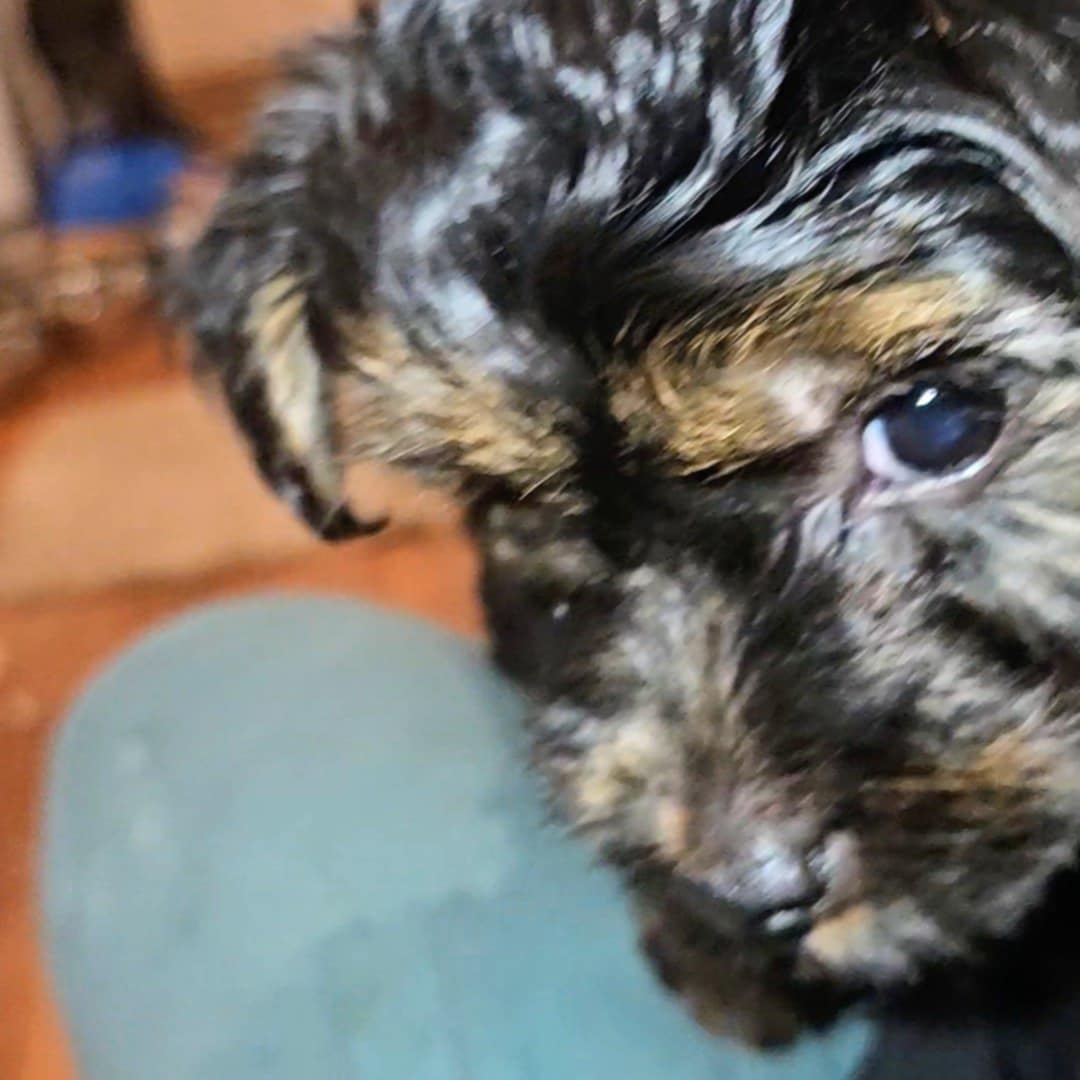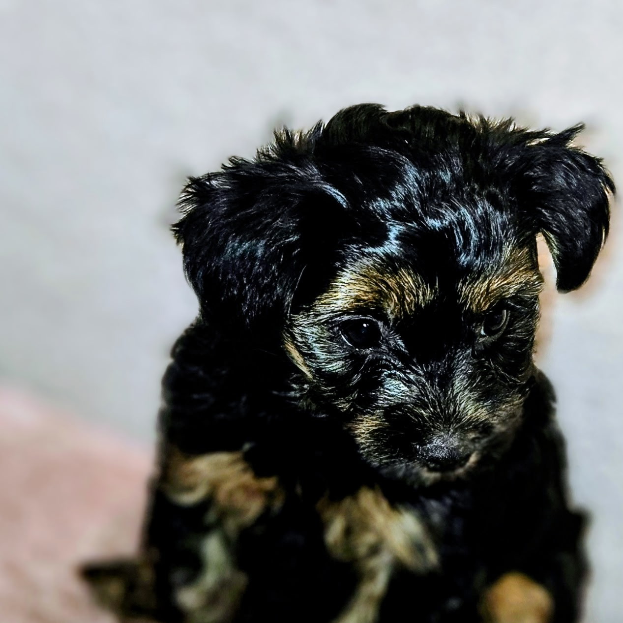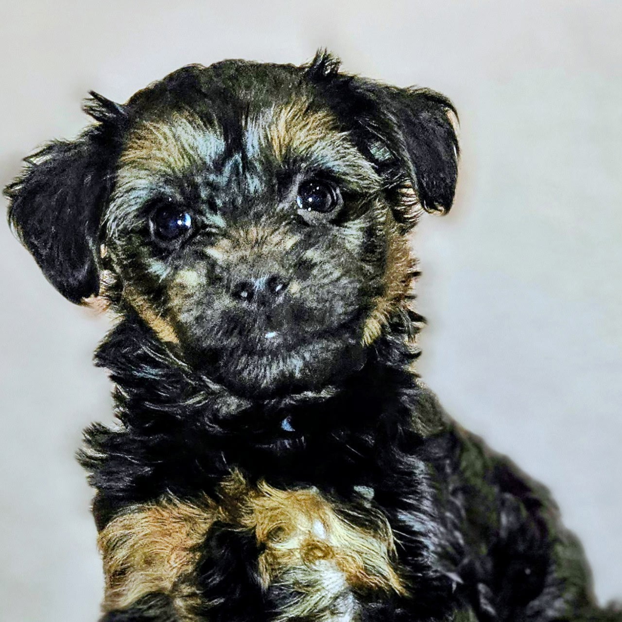 Sire: Sir Ernest "Finn" Boggswerth. Finn is a 3 year old "Teacup" size Yorkipoo - (tri color straight hair yorki dominate) and weighs about 7 pounds. Finn is a protector by nature and is shy, but once he warms up to you he will snuggle and give you googgly eyes till you heart melts. He takes an active supportive roll raising and caring for the pups ensuring they don't stray or finding them when the do. He will often just take over playtime when Indigo needs a break. When he is not in daddy mode....he is vibrant and will leap as high as possible with excitement upon his humans arrival home. He enjoys high places and loves to perch on a shoulder during walks. Finn is in tune with nature and has alerted his humans to upcoming events. He is a great snuggler and is very affectionate.