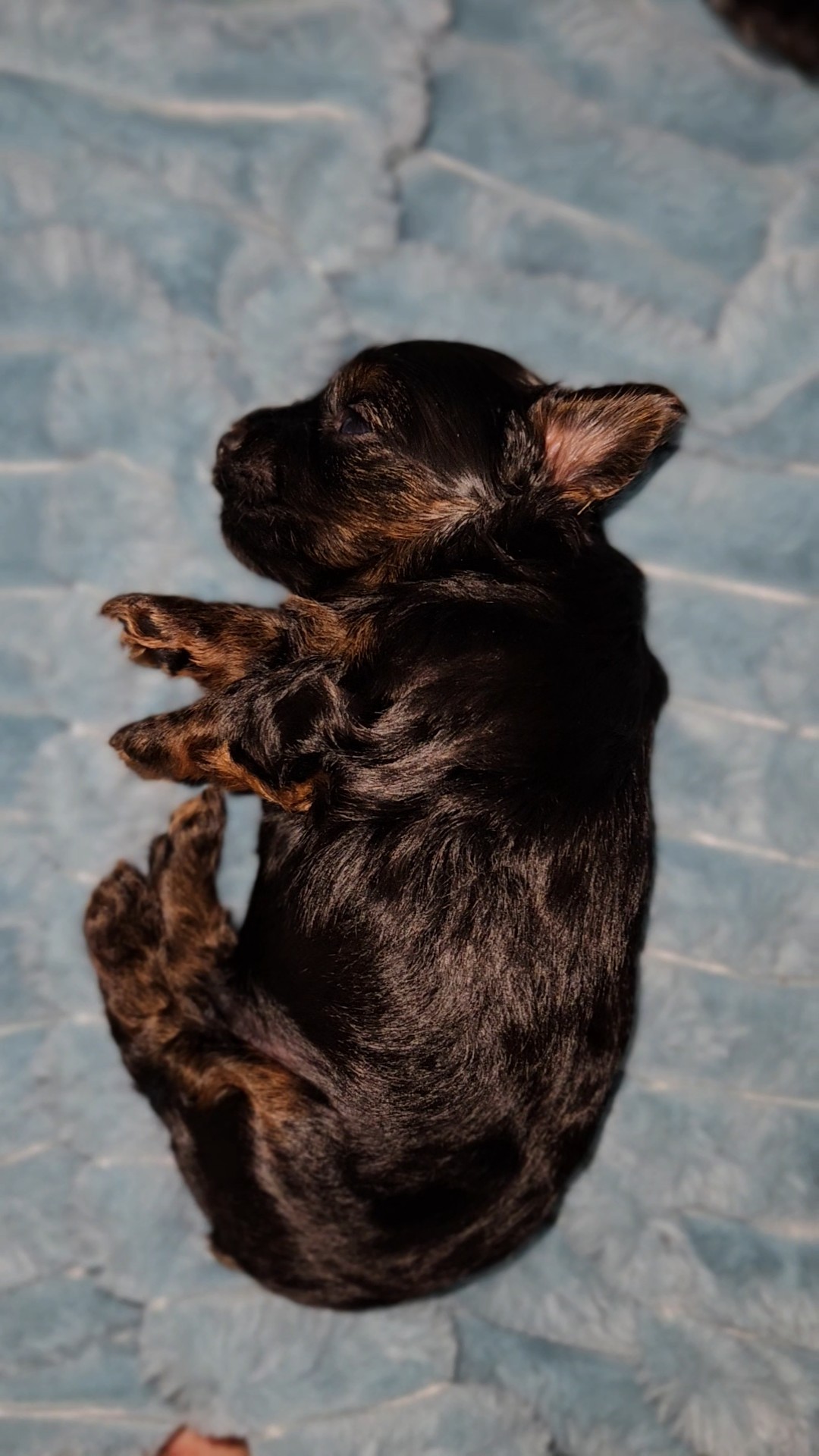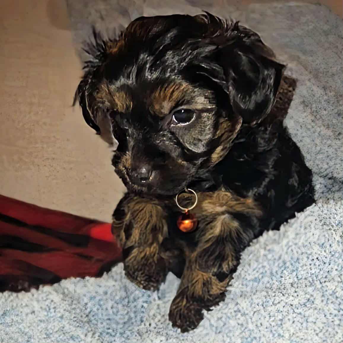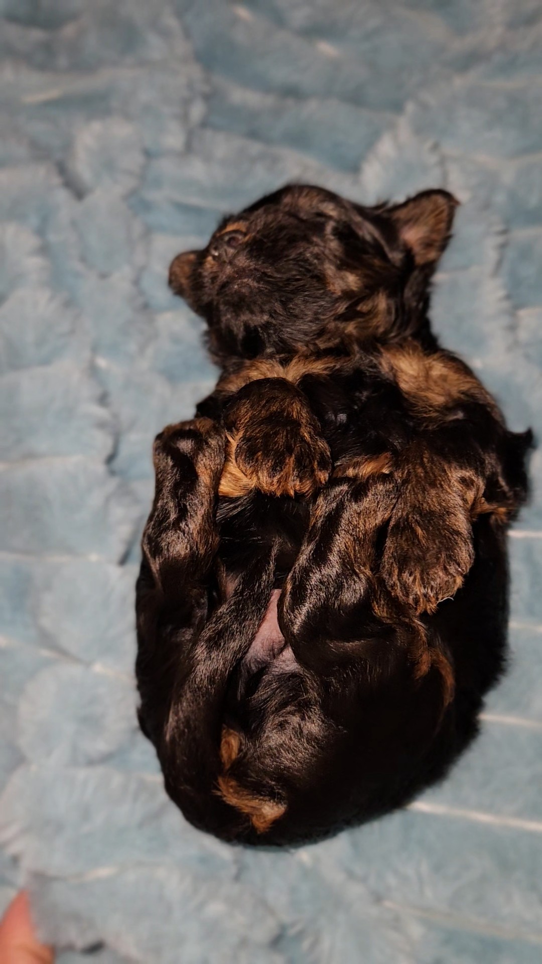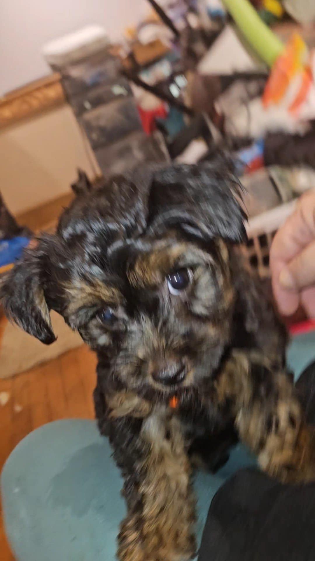 Sire: Sir Ernest "Finn" Boggswerth. Finn is a 3 year old "Teacup" size Yorkipoo - (tri color straight hair yorki dominate) and weighs about 7 pounds. Finn is a protector by nature and is shy, but once he warms up to you he will snuggle and give you googgly eyes till you heart melts. He takes an active supportive roll raising and caring for the pups ensuring they don't stray or finding them when the do. He will often just take over playtime when Indigo needs a break. When he is not in daddy mode....he is vibrant and will leap as high as possible with excitement upon his humans arrival home. He enjoys high places and loves to perch on a shoulder during walks. Finn is in tune with nature and has alerted his humans to upcoming events. He is a great snuggler and is very affectionate.