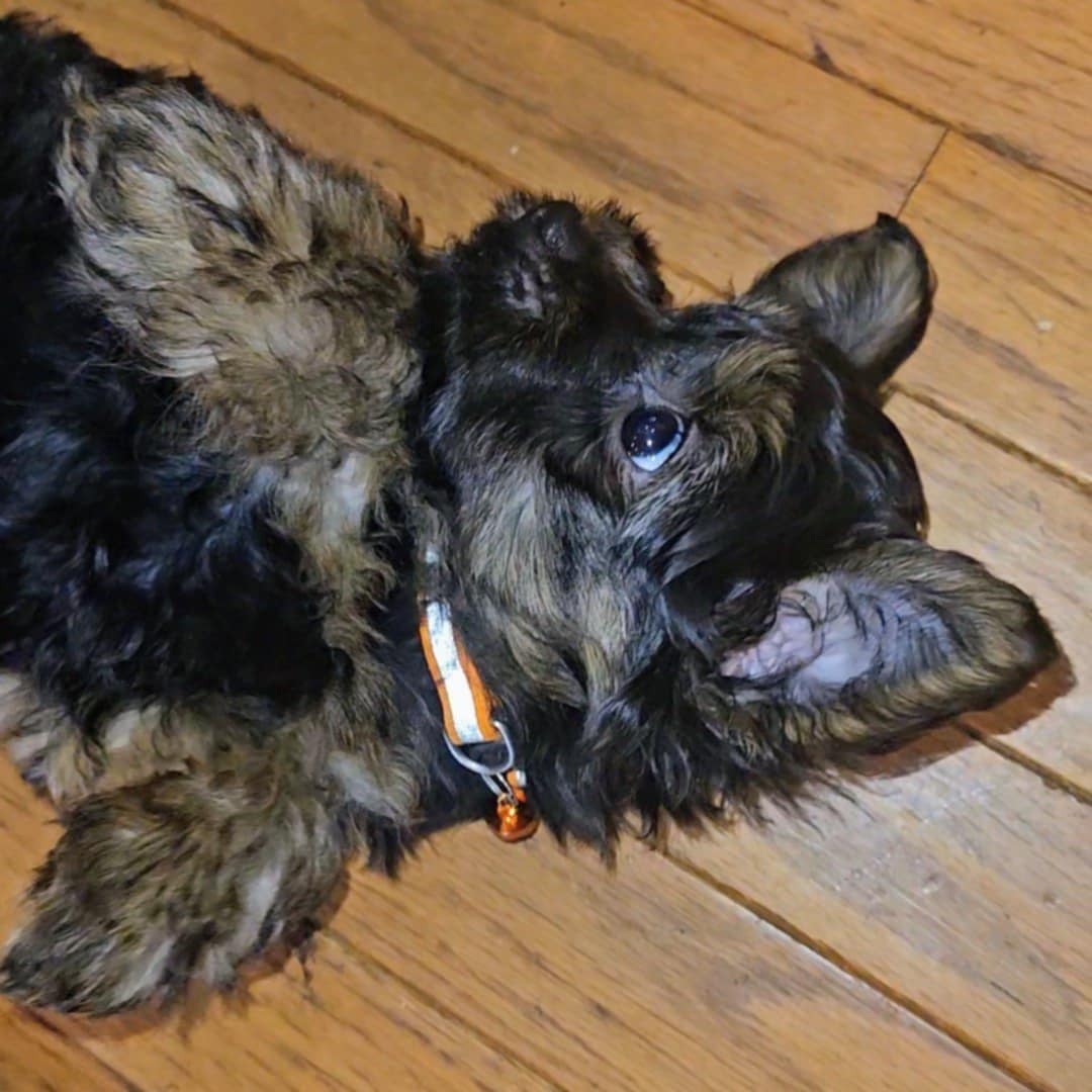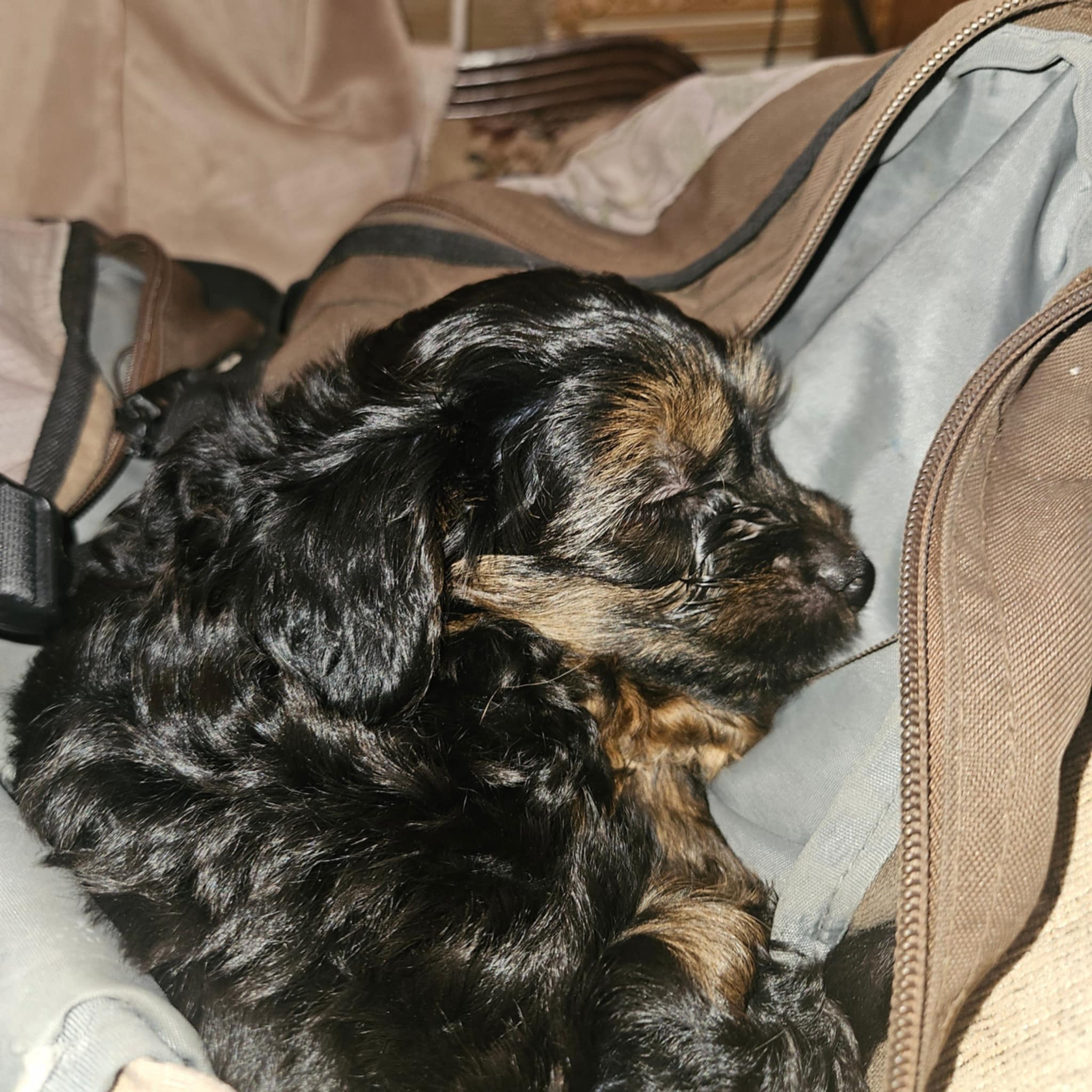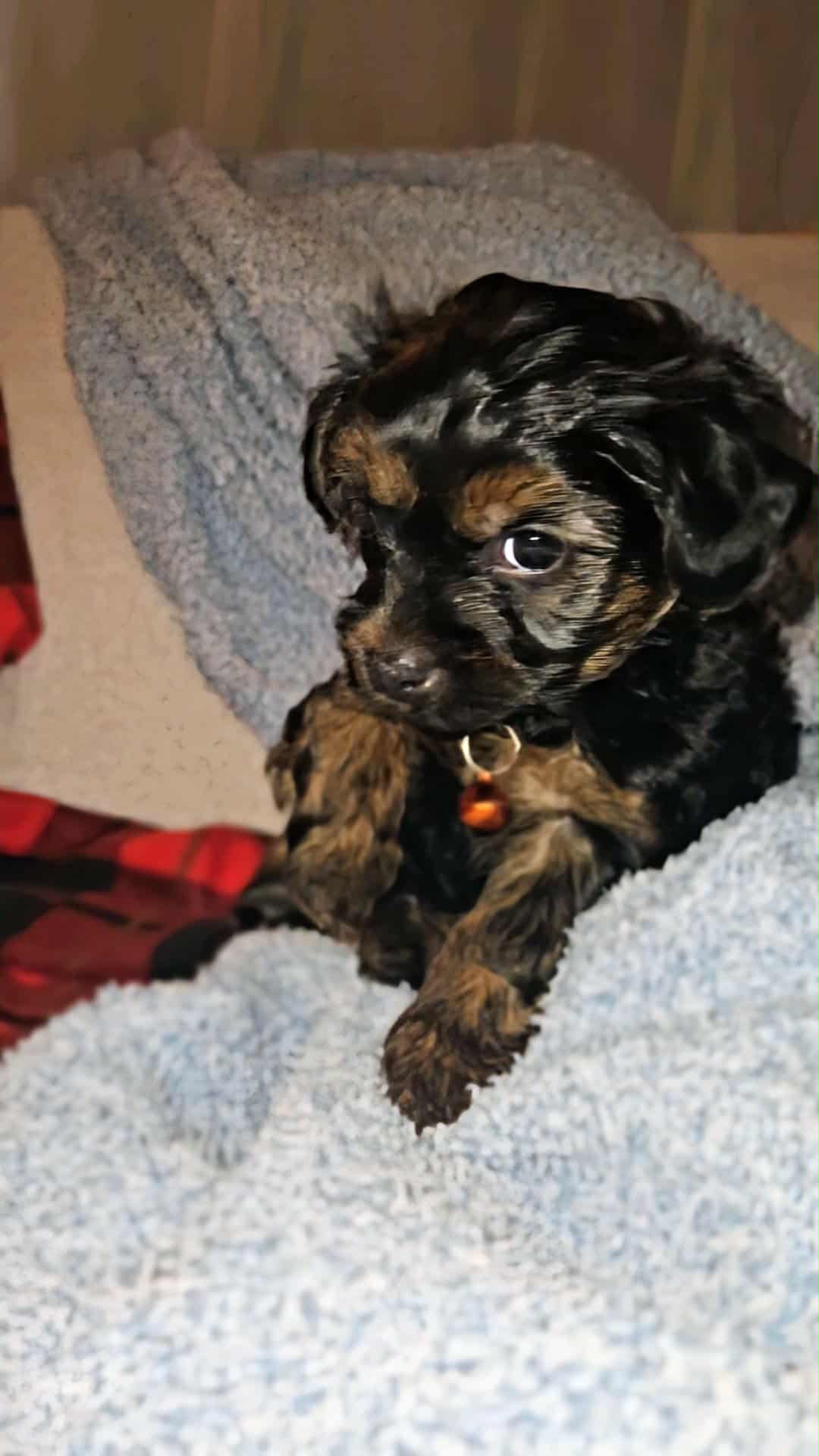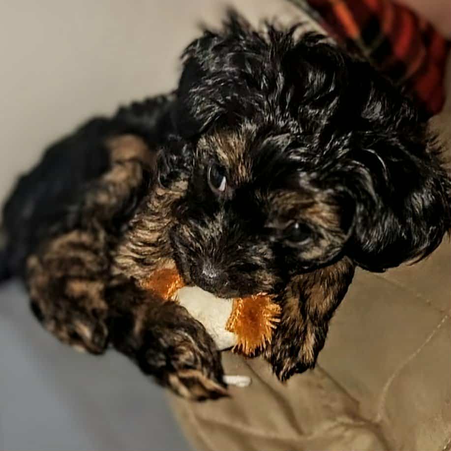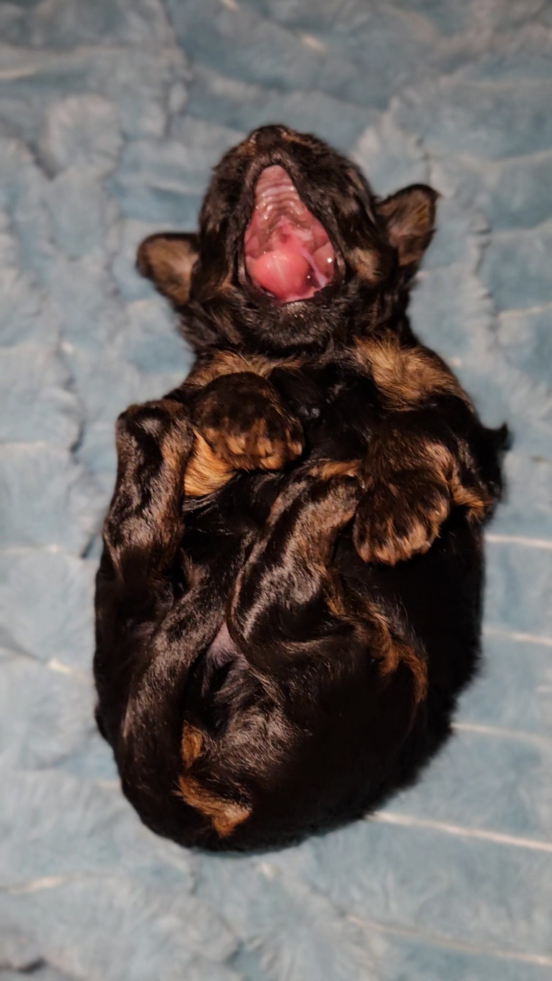 Sire: Sir Ernest "Finn" Boggswerth. Finn is a 3 year old "Teacup" size Yorkipoo - (tri color straight hair yorki dominate) and weighs about 7 pounds. Finn is a protector by nature and is shy, but once he warms up to you he will snuggle and give you googgly eyes till you heart melts. He takes an active supportive roll raising and caring for the pups ensuring they don't stray or finding them when the do. He will often just take over playtime when Indigo needs a break. When he is not in daddy mode....he is vibrant and will leap as high as possible with excitement upon his humans arrival home. He enjoys high places and loves to perch on a shoulder during walks. Finn is in tune with nature and has alerted his humans to upcoming events. He is a great snuggler and is very affectionate.