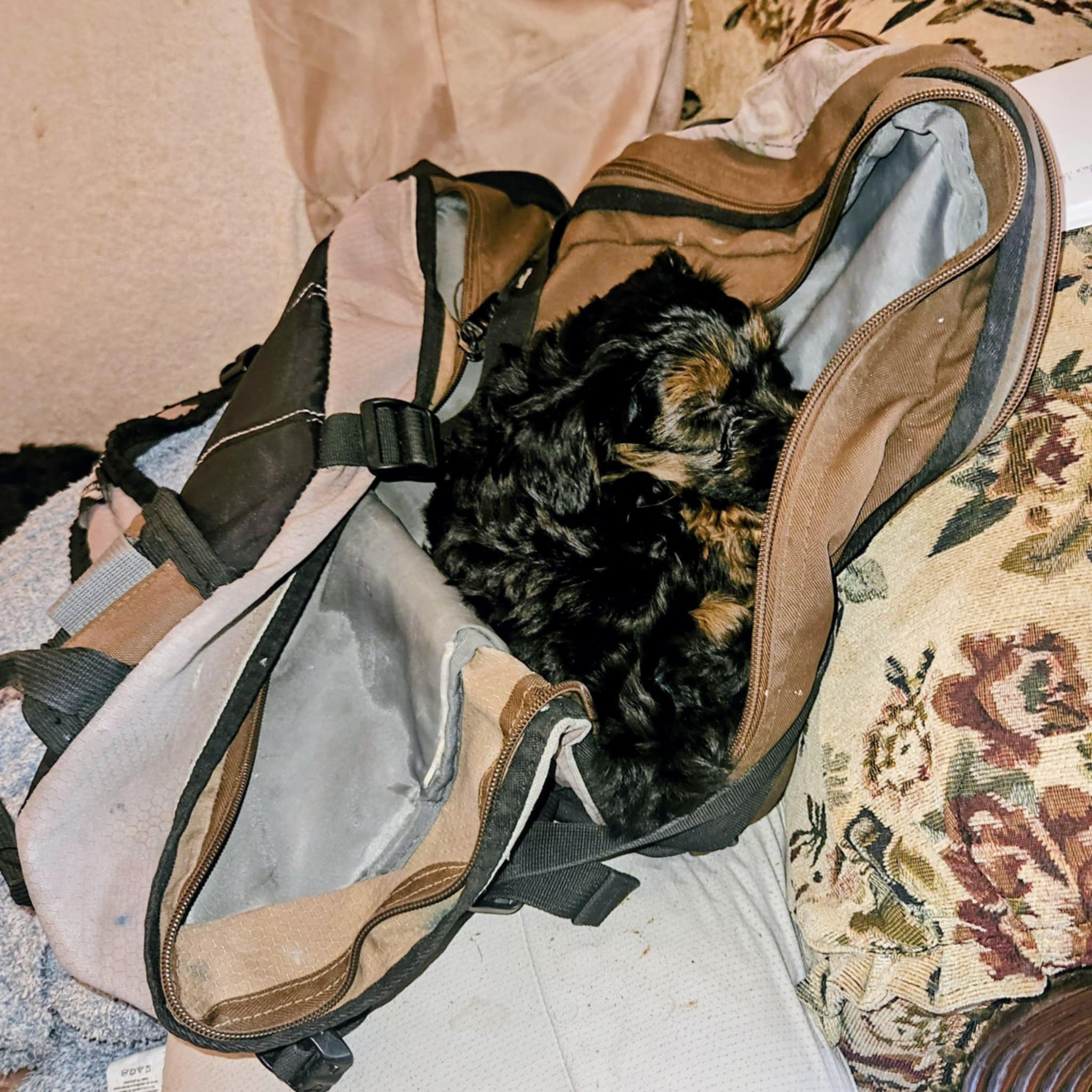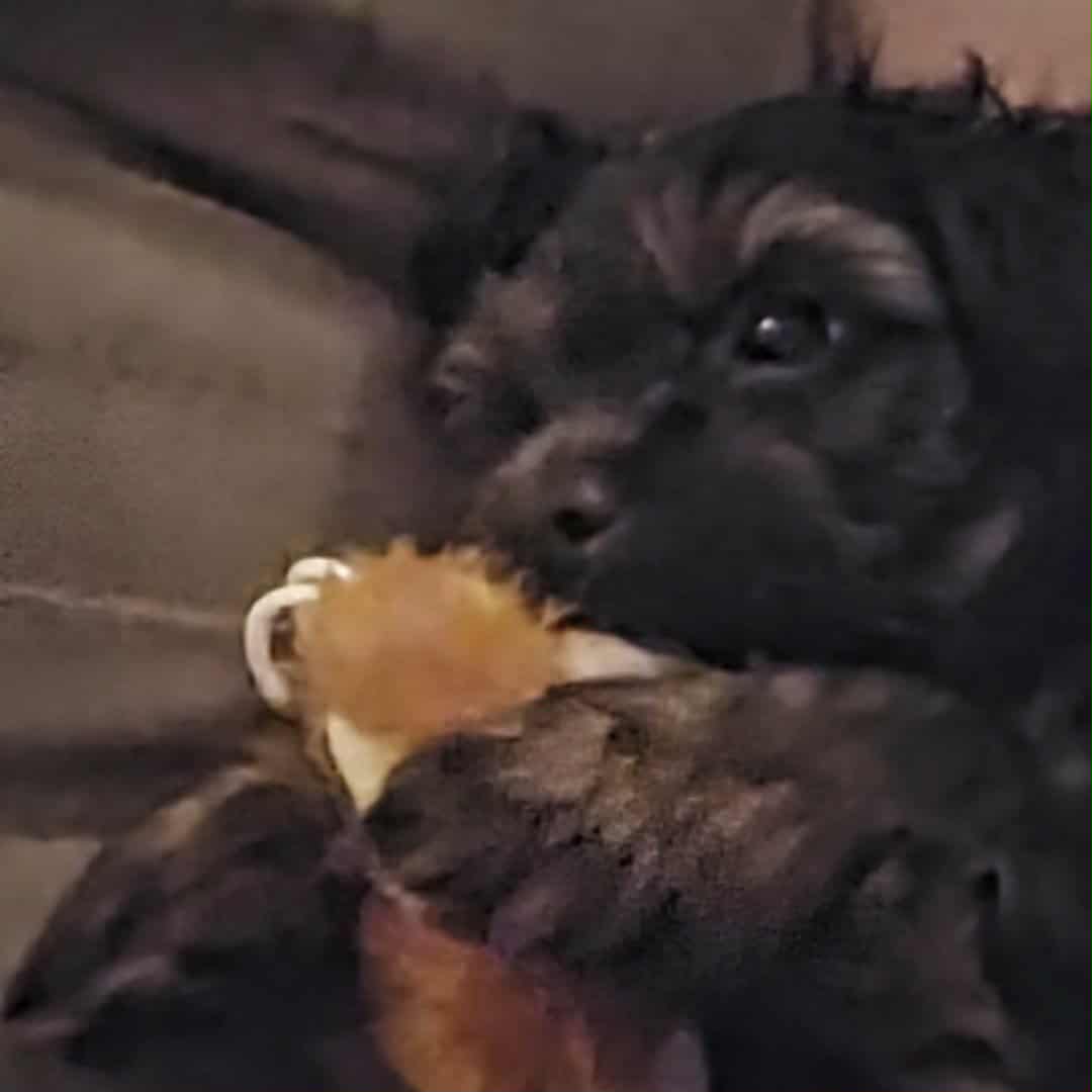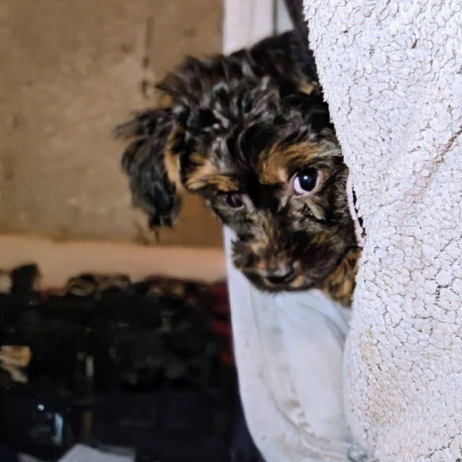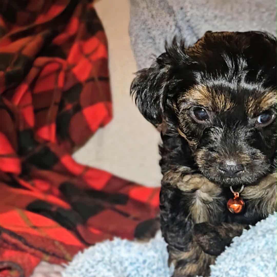 Sire: Sir Ernest "Finn" Boggswerth. Finn is a 3 year old "Teacup" size Yorkipoo - (tri color straight hair yorki dominate) and weighs about 7 pounds. Finn is a protector by nature and is shy, but once he warms up to you he will snuggle and give you googgly eyes till you heart melts. He takes an active supportive roll raising and caring for the pups ensuring they don't stray or finding them when the do. He will often just take over playtime when Indigo needs a break. When he is not in daddy mode....he is vibrant and will leap as high as possible with excitement upon his humans arrival home. He enjoys high places and loves to perch on a shoulder during walks. Finn is in tune with nature and has alerted his humans to upcoming events. He is a great snuggler and is very affectionate.