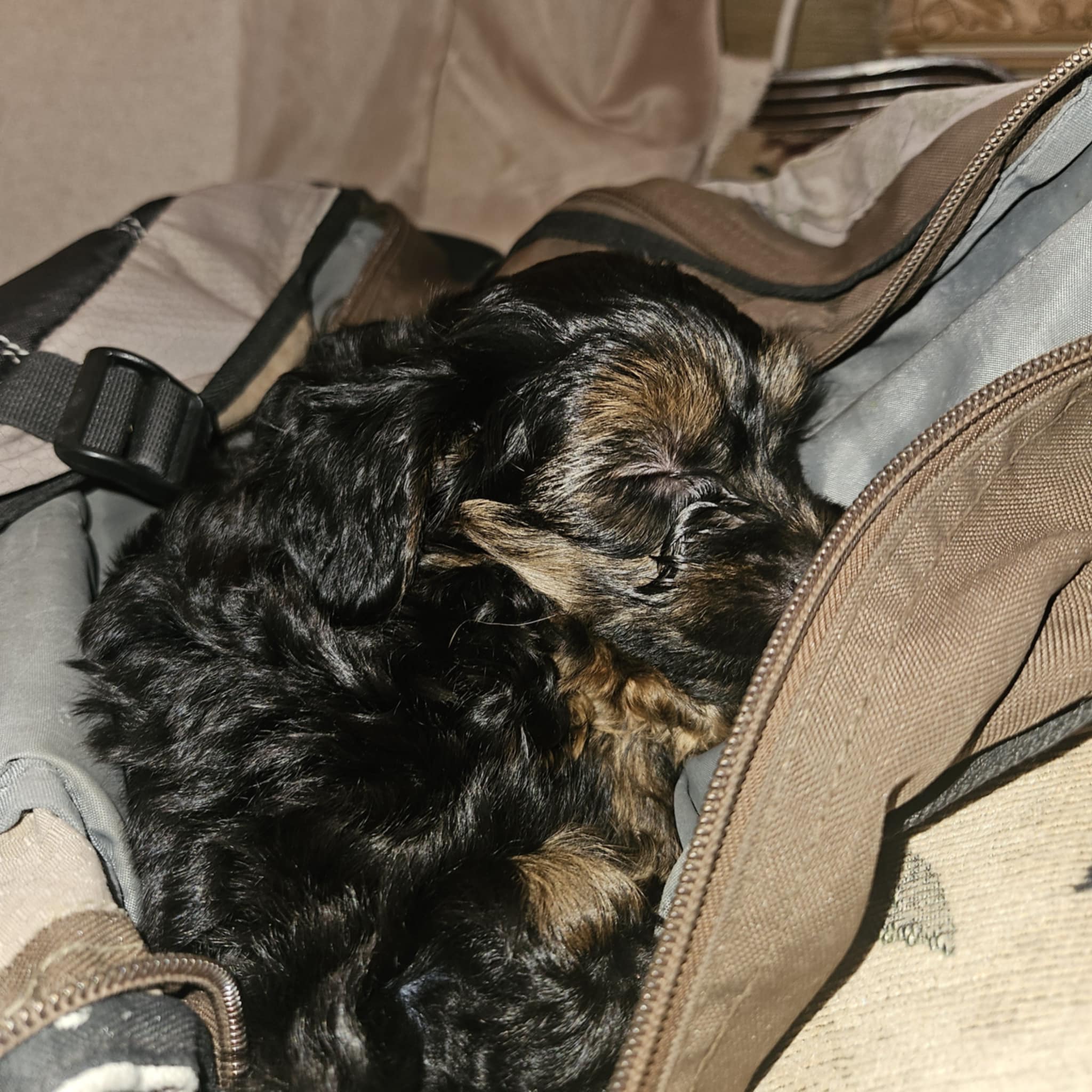 Dam: Lady "Indigo" August.......Indigo is a 4.5 year old "Toy" size Yorkipoo - (black curly hair with white chin tuffs, poodle dominate) and weighs about 9 pounds. Indigo is mellow and takes everything in stride. She loves to meet people, hike, bike and motorcycles. She enjoys dressing up and being carried in a pouch or back pack. Her snuggle rating is off the chart. When she is not engaged in a family adventure, she loves to watch movies and just hangout. Her favorite spot is nesting between her two humans with buddy Finn in paws reach.