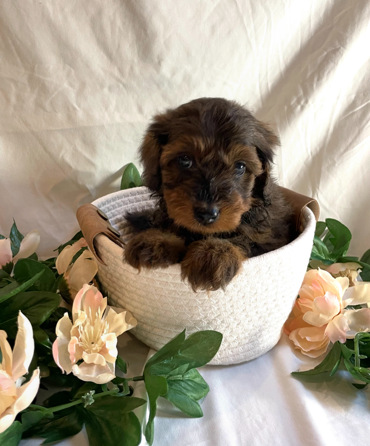 Willow is an F1 Mini Aussiedoodle and a beloved member of our family. Raised in our home, she’s loyal, energetic, and always eager to please. Willow is an excellent little watchdog—alert and attentive, yet loving and affectionate with everyone she knows.