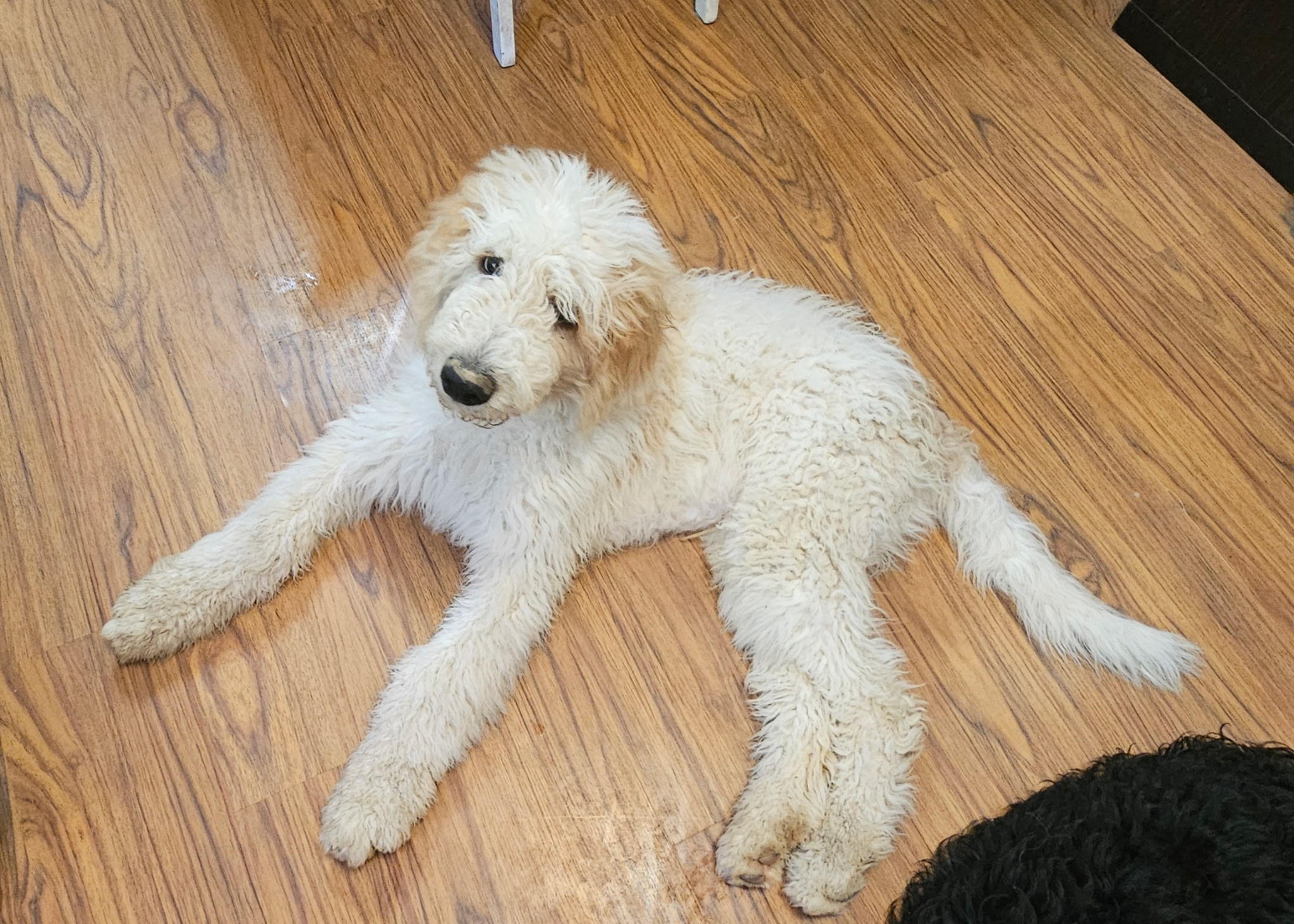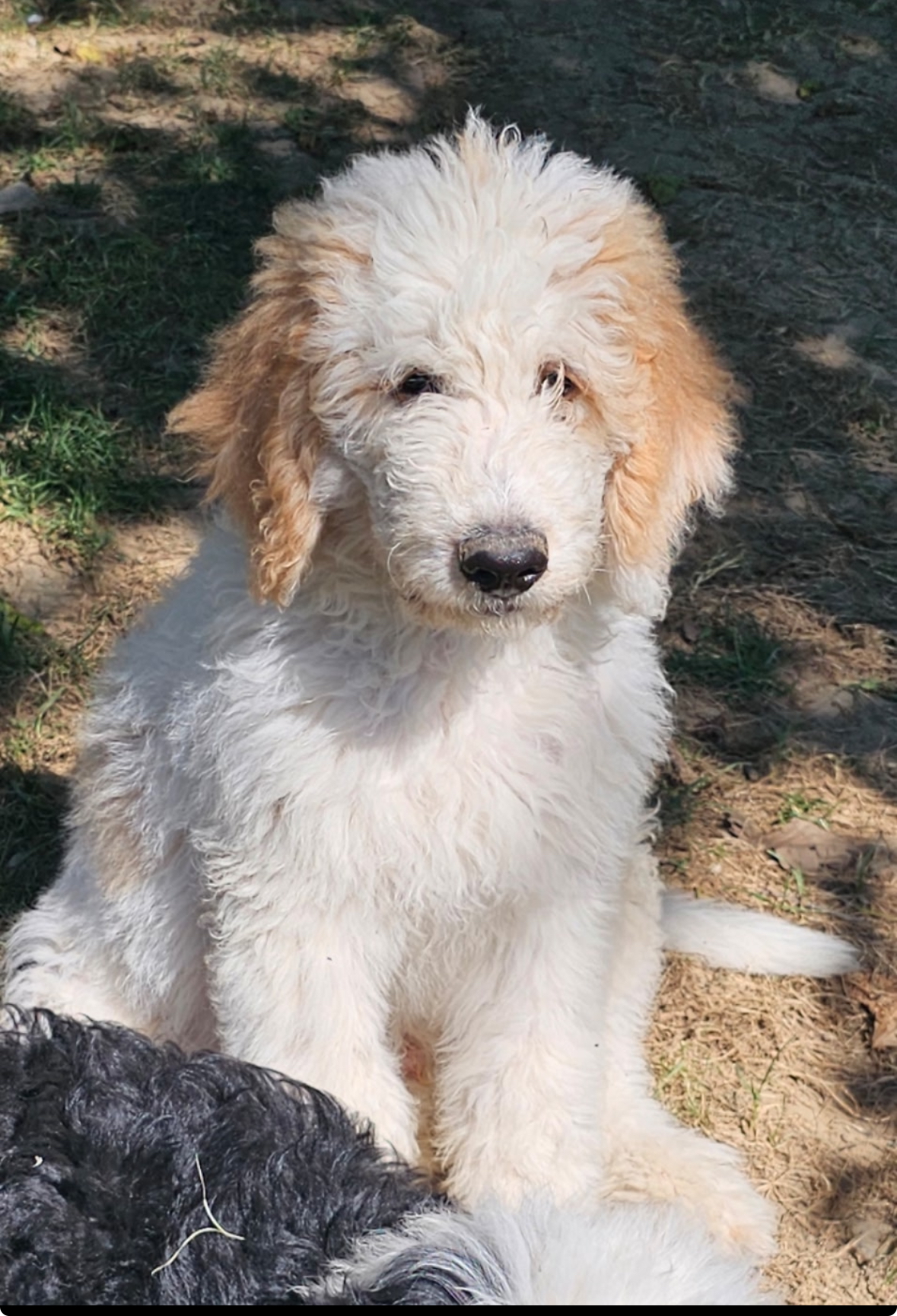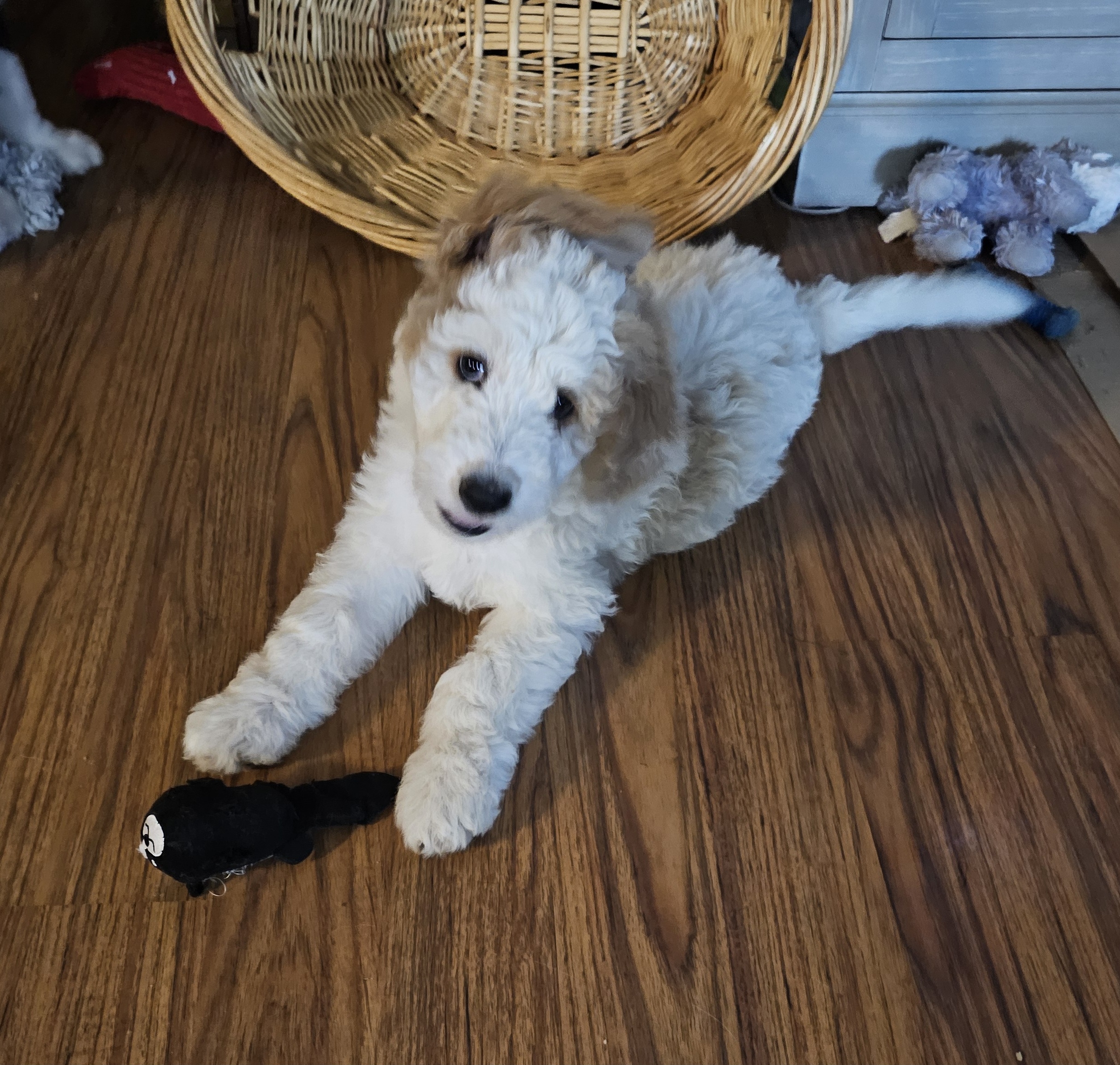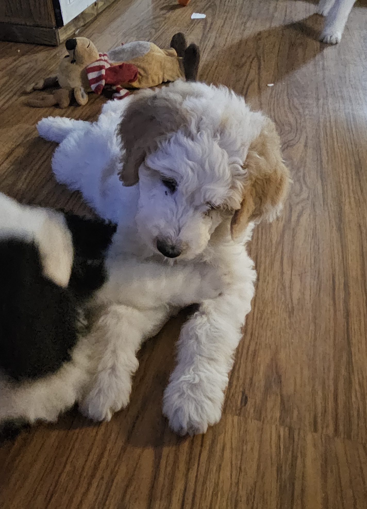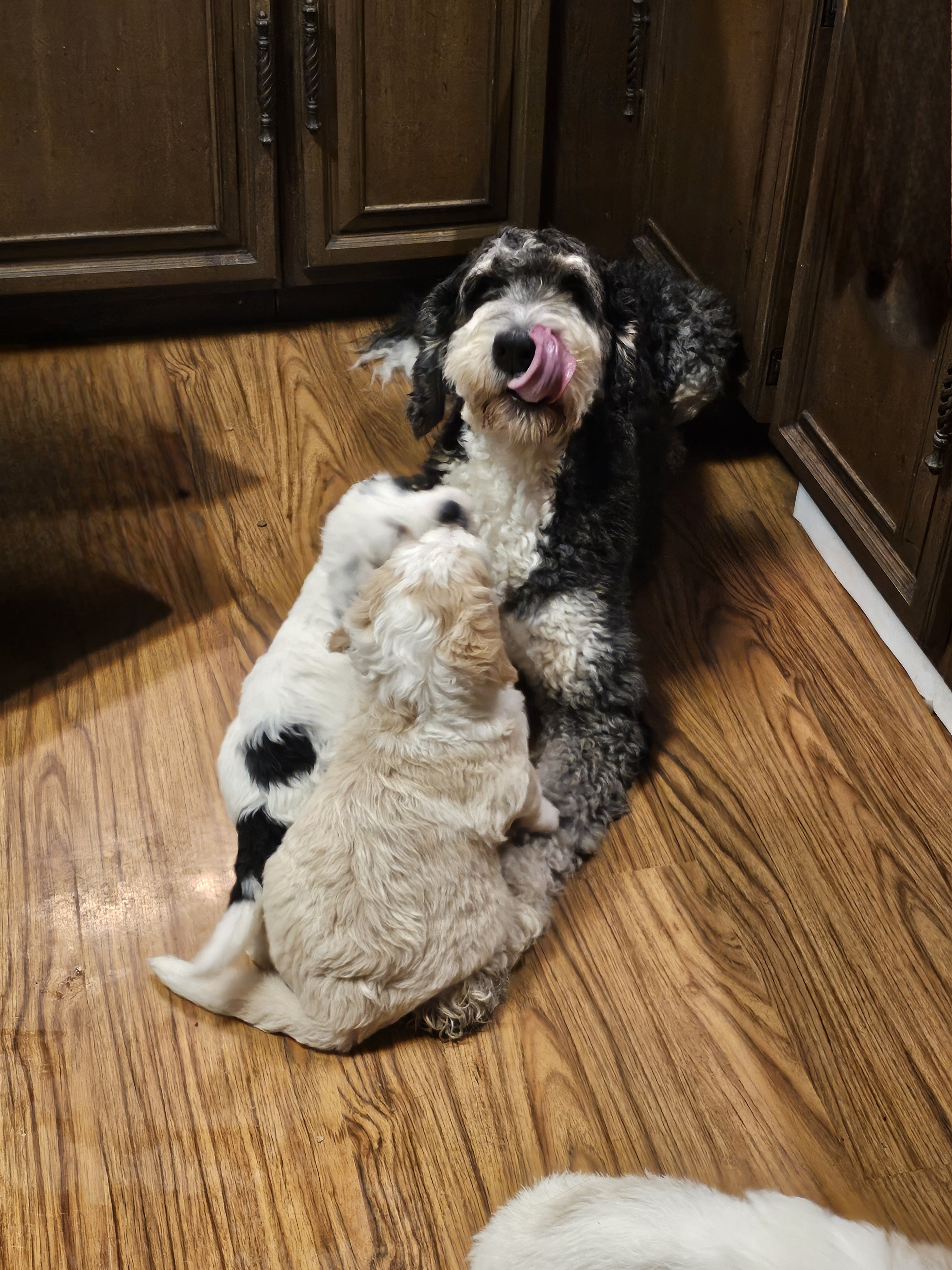 Meet our Double Doodle puppies! Their mom is an F1 Bernedoodle and their father is a Sheepadoodle. They are allergy friendly and will be about 70 lbs. at maturity.
