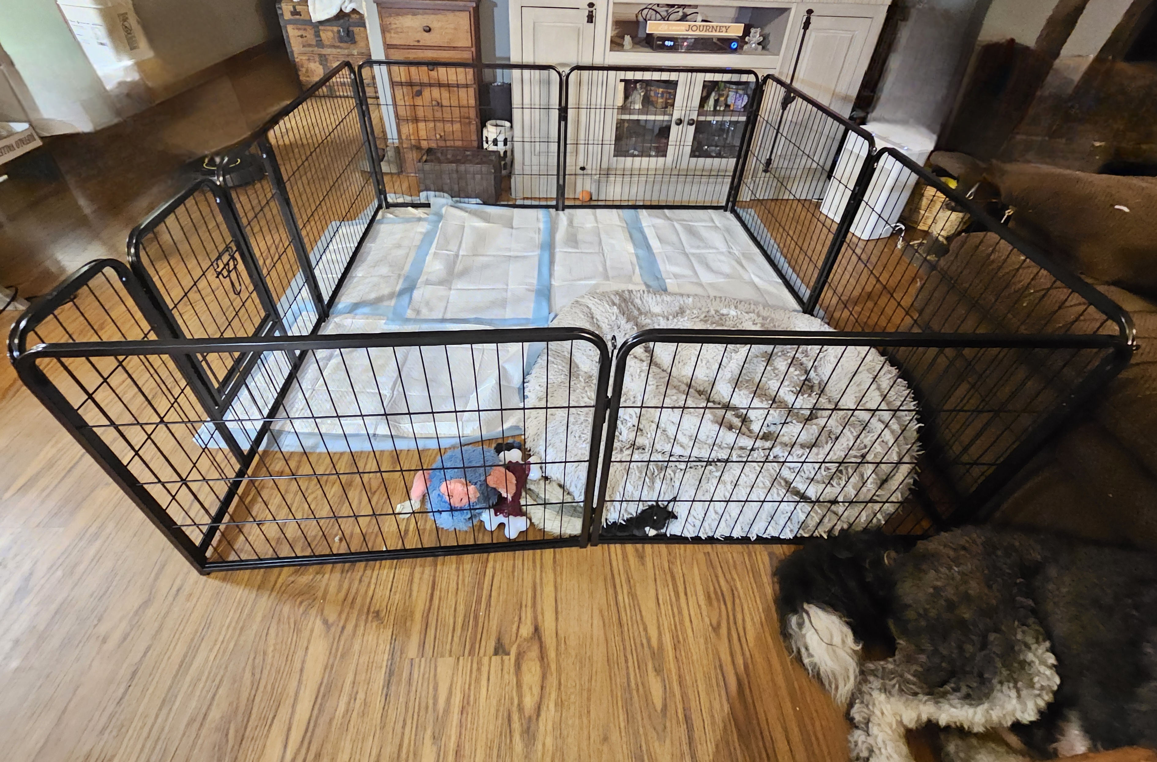Our puppies began life in their very own bedroom for privacy and have now been moved into our living room where they sleep at night but have run of our kitchen area during the day for more space to stretch out. We started housebreaking them at 4 weeks of age taking them out in our fenced in yard every couple of hours. We are also working on stairs....Going up is easier than going down but they finally have it mastered! Please remember it can take months to fully housebreak a puppy. They are just babies after all.They have been socialized with kids and cats also.