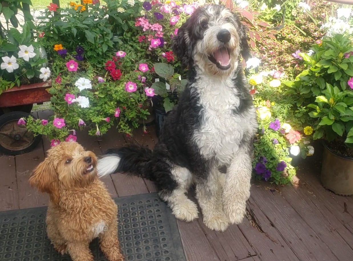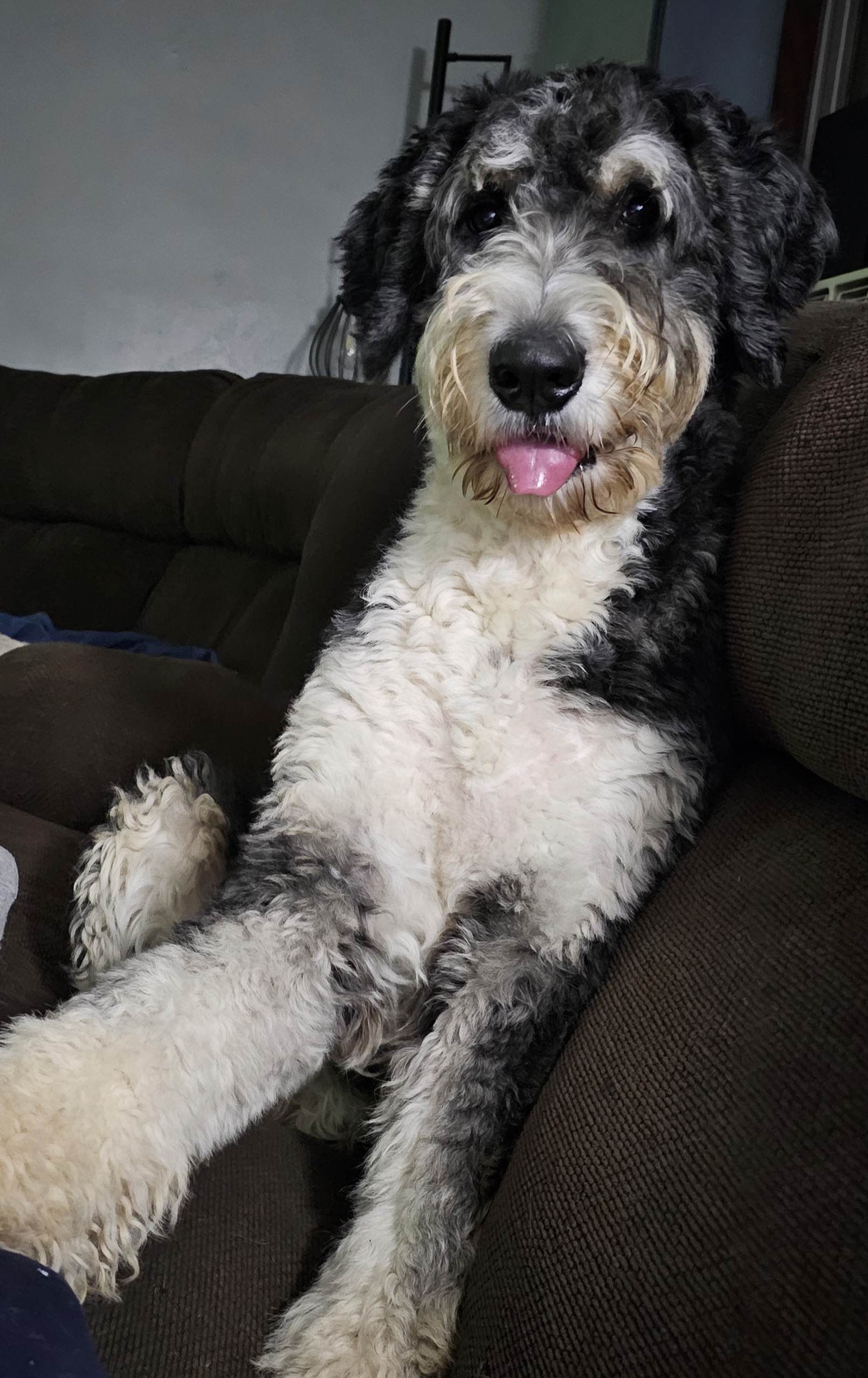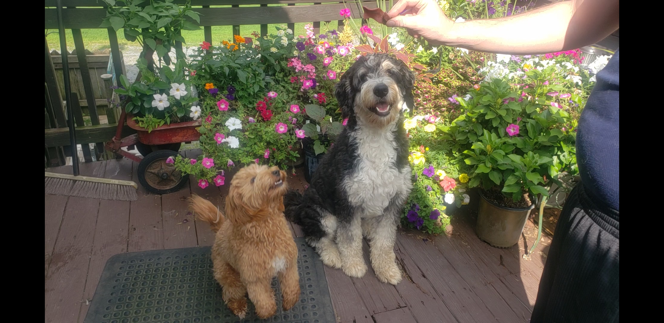 Baisy, momma, is an F1 Bernedoodle. She's super smart and is a great 1st time mom. Her favorite hobby is to jump in the car and go for a ride even if it's just around the block. She loves her mini goldendoodle sister and her cat brothers and sisters. She weighs about 70 lbs.