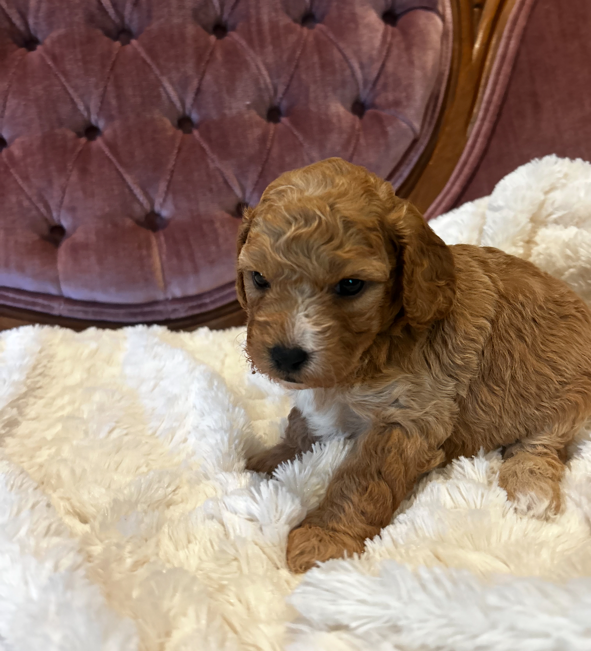 Meet our litter of 10 F1b Mini Goldendoodle puppies! The puppies were born and raised in my bedroom. They are used to touch and being held. They are well socialized with people! Their mother is our family dog and also raised in our home. We anticipate that the puppies will be 20-25 lbs at maturity. They are allergy friendly.