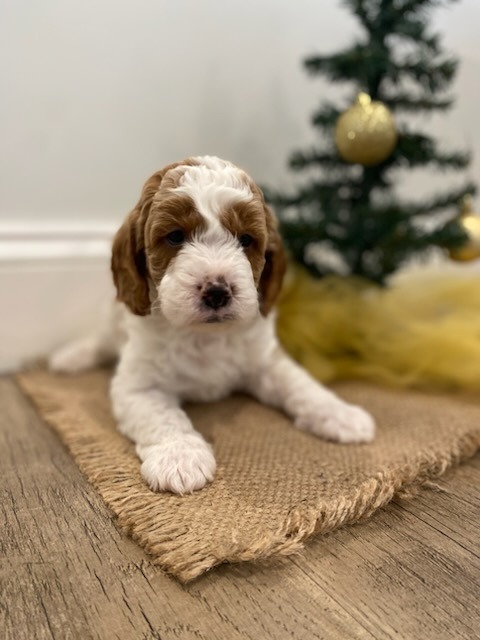 Meet Frosty, a handsome red and white parti F1b Cavapoo boy with a gentle soul and an easygoing nature. He’s the quieter one of the bunch - a little reserved at first, but once he warms up, his sweet, affectionate personality truly shines. Frosty takes his time to observe before jumping in, preferring calm play and close cuddles over chaos and noise. With his soft, thoughtful eyes and steady temperament, he’s the kind of puppy who will bond deeply with his people and bring a peaceful, loyal presence to his forever home.