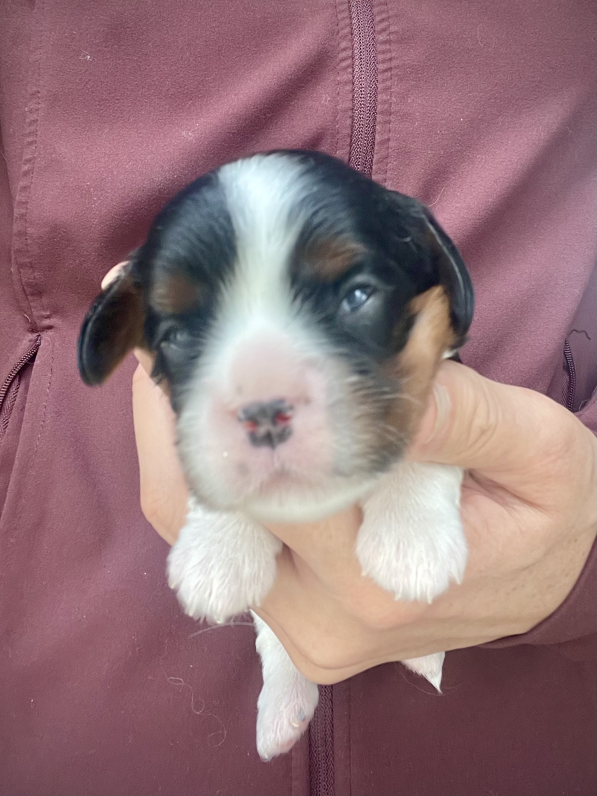 Meet Martha May, a gorgeous Tri-Color Cavalier King Charles Spaniel girl whose gentle presence is already making hearts melt. With her soft markings and calm demeanor, she carries herself with quiet grace, curious but never in a rush. Even at just a couple of weeks old, Martha May seems content to take in the world around her, enjoying warmth, comfort, and the closeness of human touch. As she grows, she’s expected to be affectionate, easygoing, and full of that timeless Cavalier charm that makes the breed so adored.
