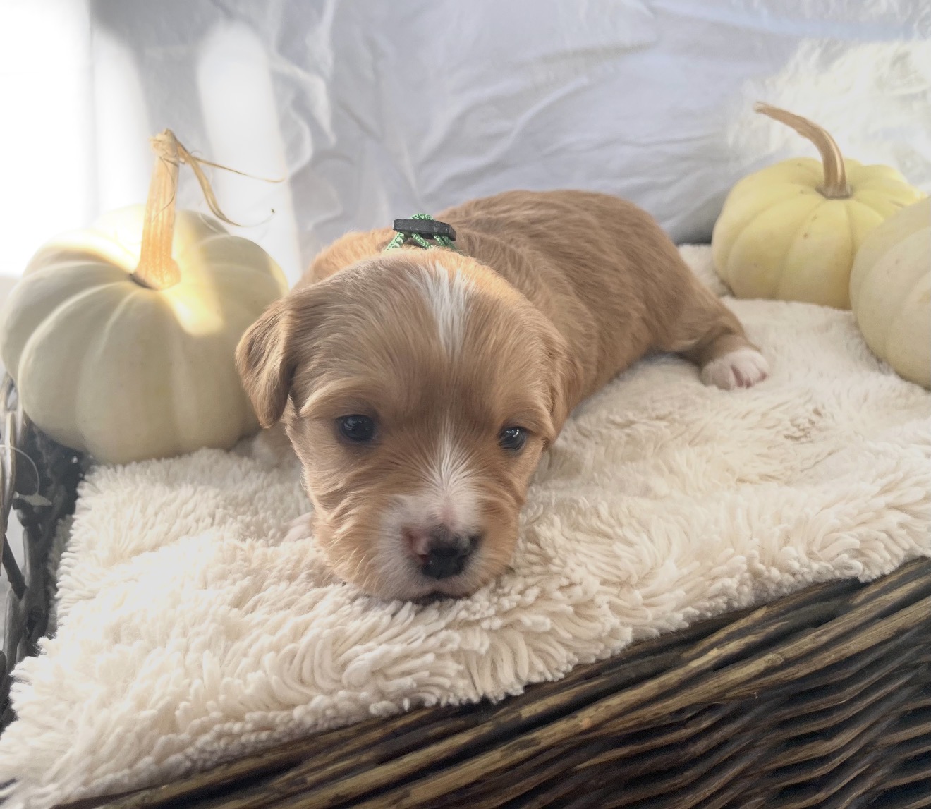 Meet Rocky, an adorable caramel and white Munchkin Bernedoodle boy with a tiny white snip on his nose and a sweet little star marking that make him truly one of a kind. Just over two weeks old, Rocky is already showing a fun, curious spark - he loves to nuzzle in close but isn’t afraid to wiggle his way to the front when it’s time for attention. His gentle playfulness and affectionate spirit make him the perfect blend of lively and loving.