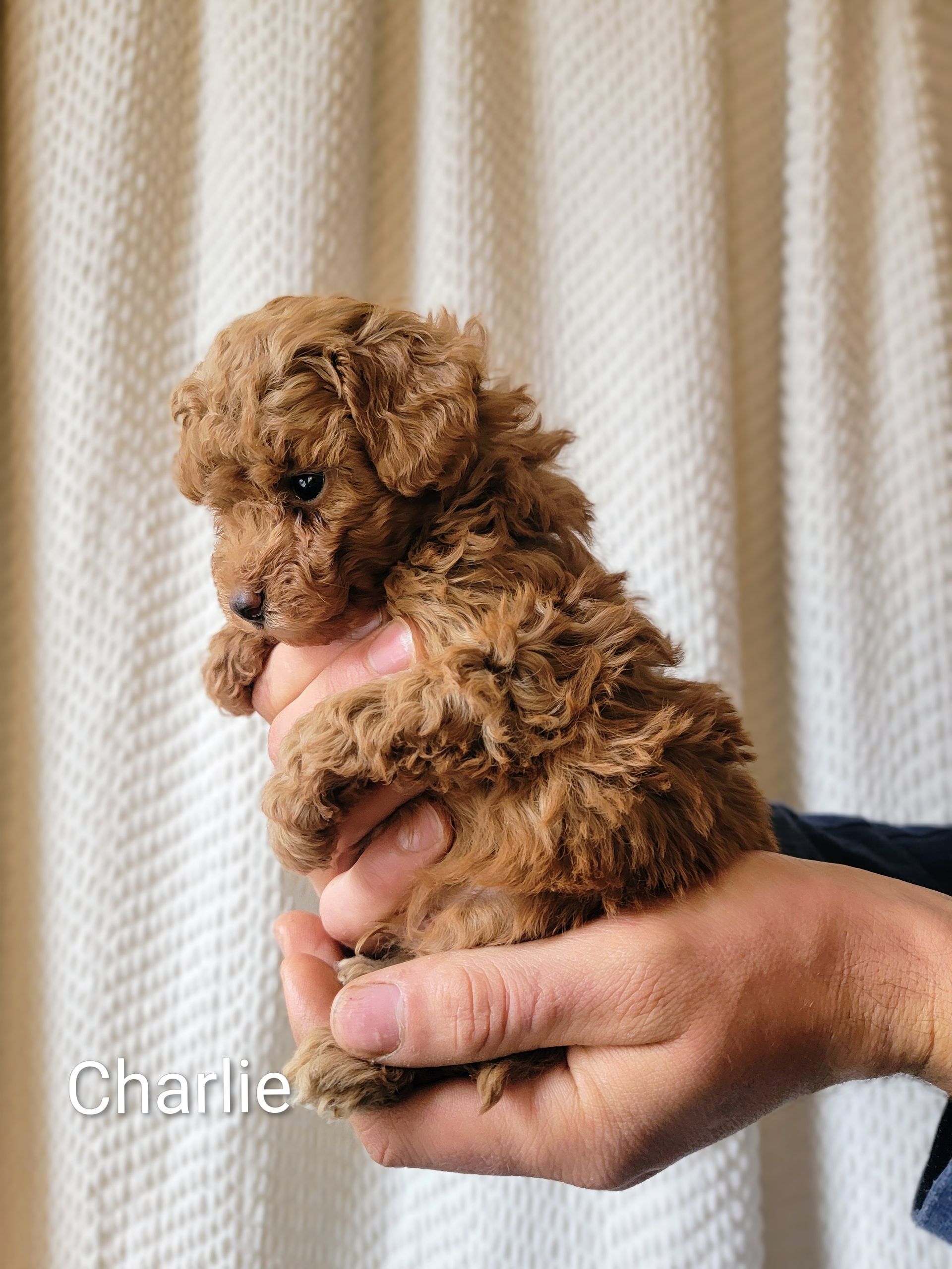 Meet Charlie. A tiny Toy Poodle with a big personality. He’s spunky, playful, and always ready for a good wrestle. Friendly, sweet, and full of charm, Charlie makes every moment more fun.