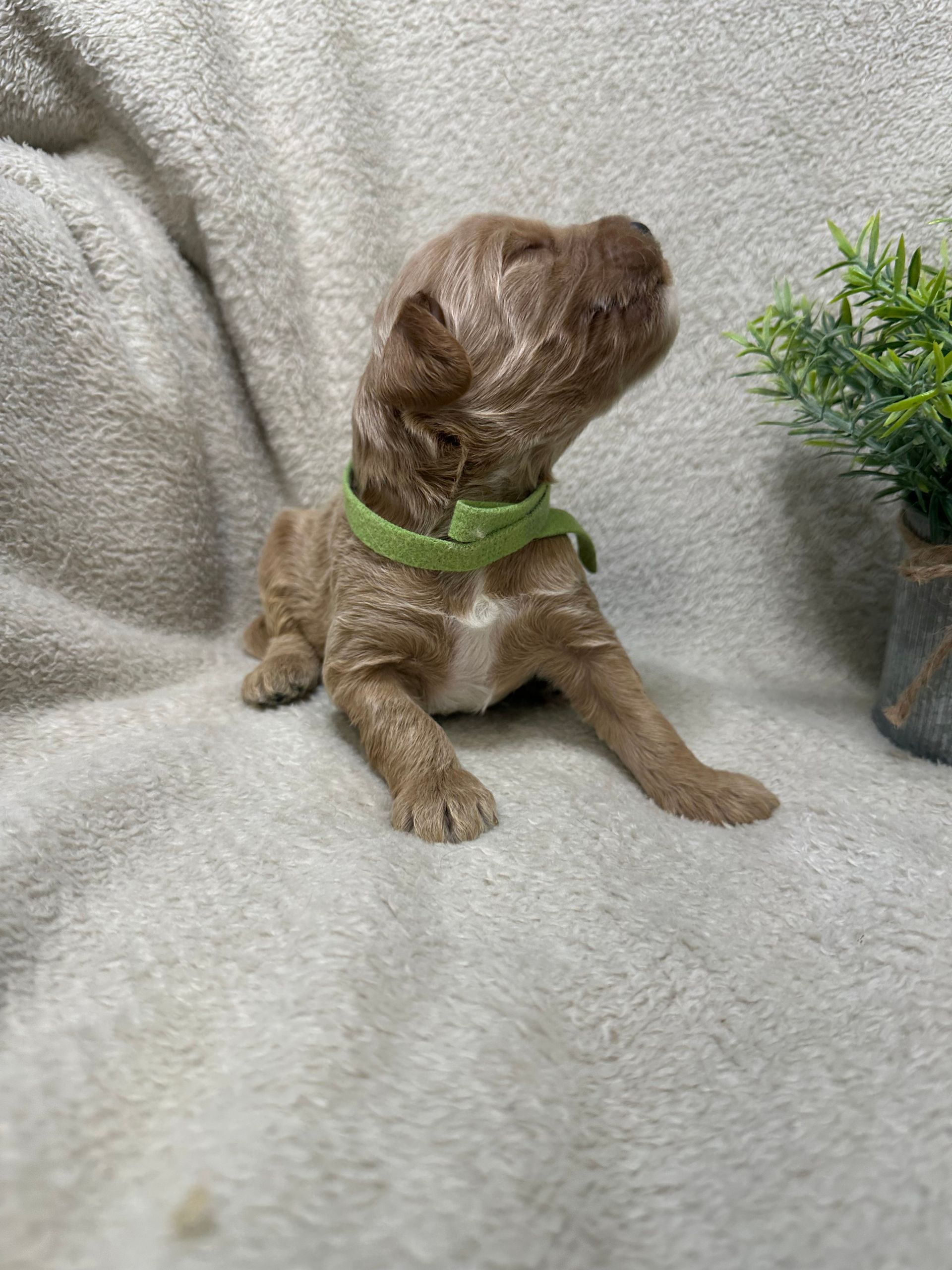 Cheer is a happy, affectionate male Mini Irishdoodle with a soft, straight apricot coat and an irresistibly sweet personality. True to his name, Cheer brings a joyful, gentle energy wherever he goes. He loves human attention and thrives on companionship, making him a wonderful family puppy.