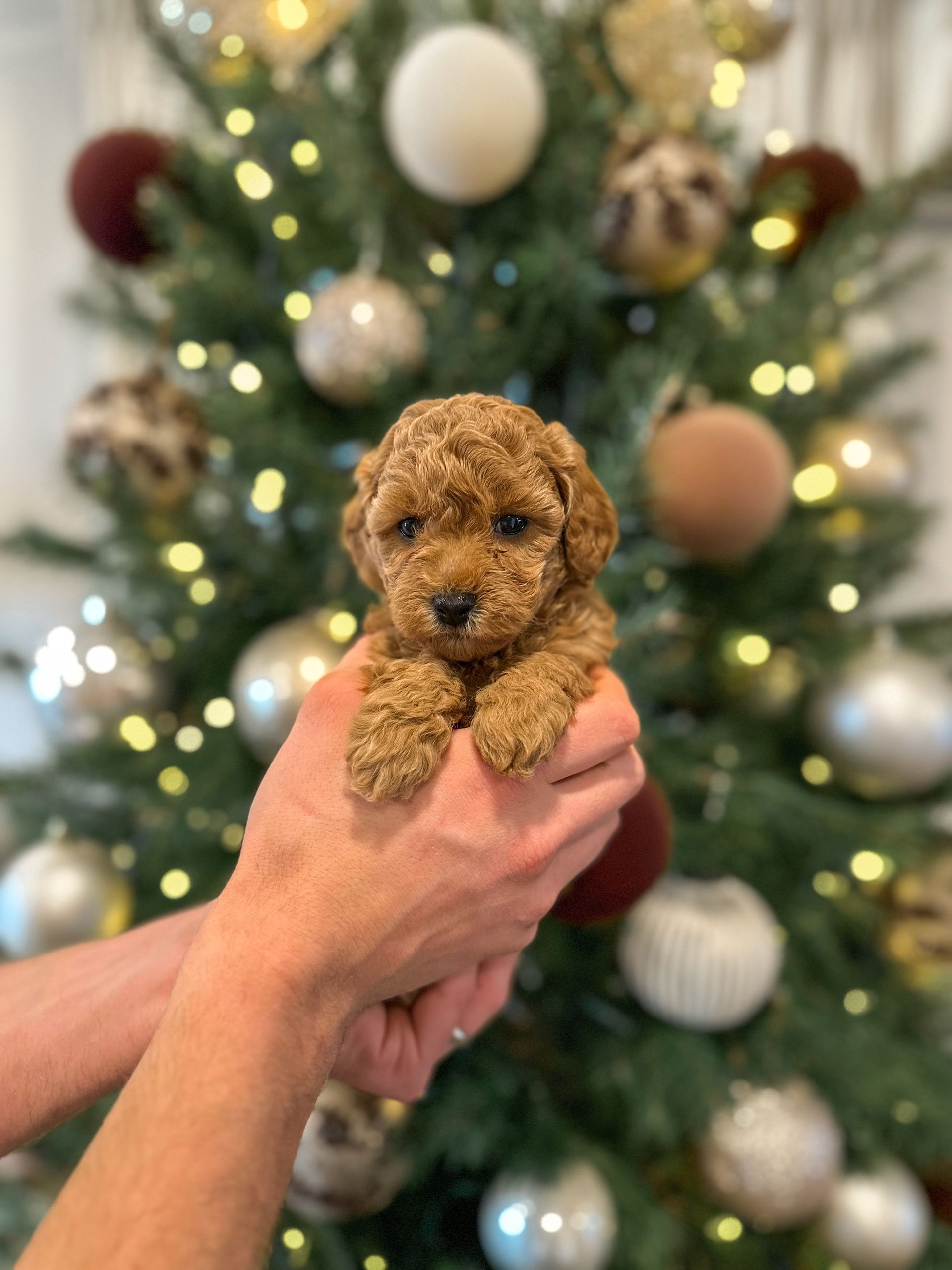 Fern is such a sweetie — outgoing, friendly, and full of fun! She has a joyful personality and loves being around people, making her one of the more social puppies in the litter. Her rich caramel coat (a darker shade) gives her a stunning, warm teddy-bear coloring, and she has no white markings.