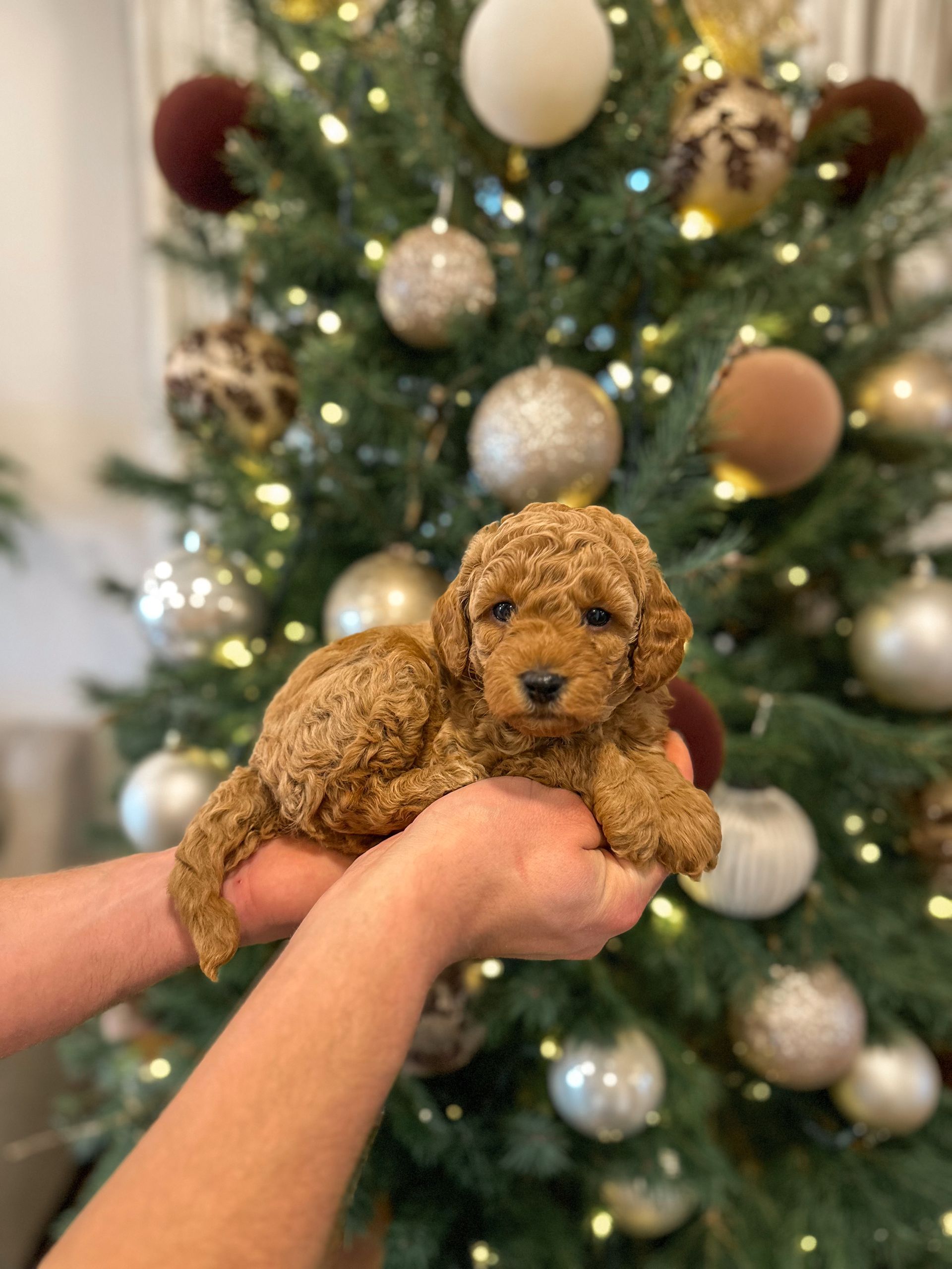 Forrest is our big boy in the litter — playful, friendly, and wonderfully outgoing! He loves people, enjoys interactive play, and brings a confident, joyful energy wherever he goes. His rich caramel coat gives him a warm, classic Goldendoodle look, and he does not have any white markings.