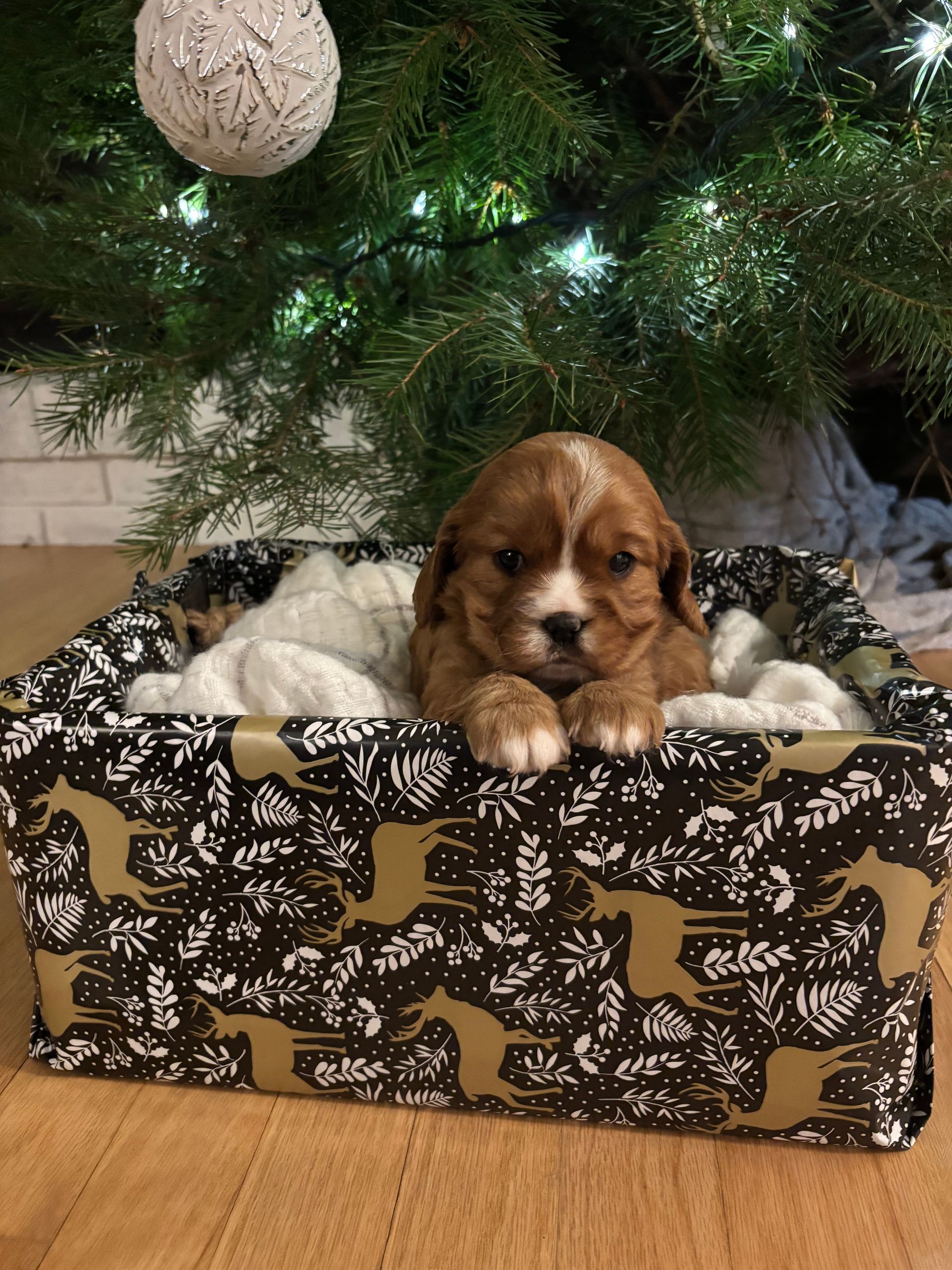 Meet Holly, a darling F1B Cavadoodle with the perfect blend of sweetness and spark. With her darker coat accented by a white forehead, white muzzle, a cute white dot on her back, and little white boots on all four paws, she is truly one-of-a-kind. Holly is the life of the party — active, curious, and always ready to explore — yet she melts right into your arms when it’s time to cuddle. She has that ideal balance of playful energy and affectionate calm, making her an easy puppy to fall in love with.