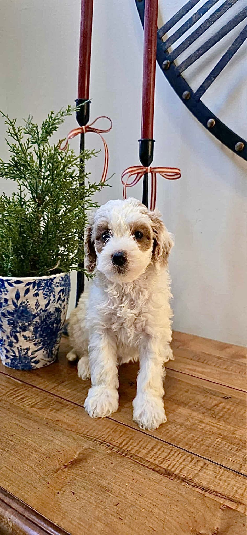 Meet Judy an apricot and white parti F1b Mini Goldendoodle with a bright and affectionate personalty and a sweet, gentle spirit. She’s playful, curious, and adores being part of family life. Raised in a home with five children, Judy is used to constant love and attention, which gives her a calm, easygoing temperament when being handled.