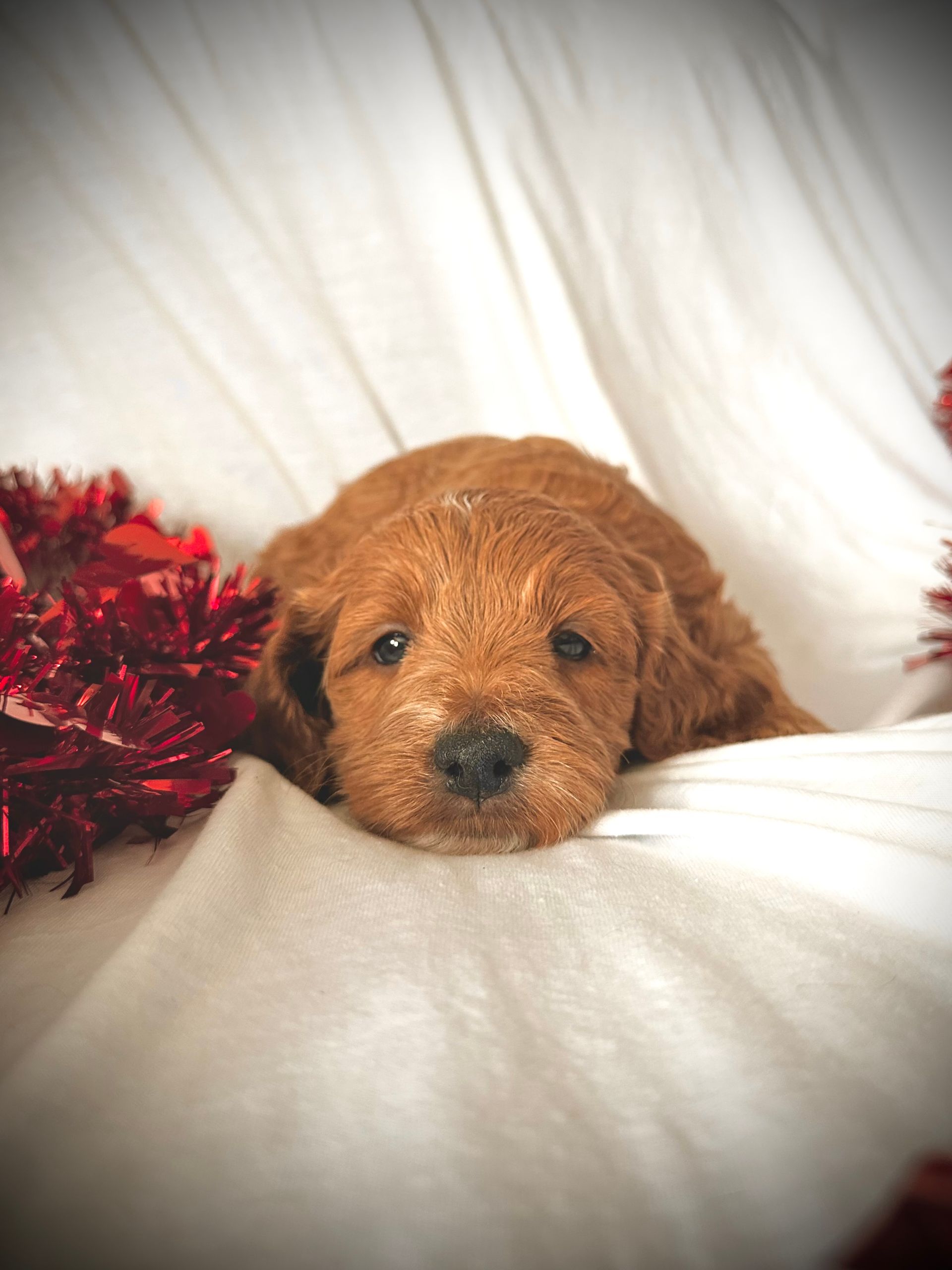 Spark is a stunning male Mini Irishdoodle with a gentle, affectionate nature and a calm, loving temperament. He enjoys playful moments but truly shines during quiet cuddle time, making him a wonderful companion for families seeking a sweet, easygoing puppy. Spark has a warm presence and a naturally relaxed demeanor that makes him easy to bond with.
